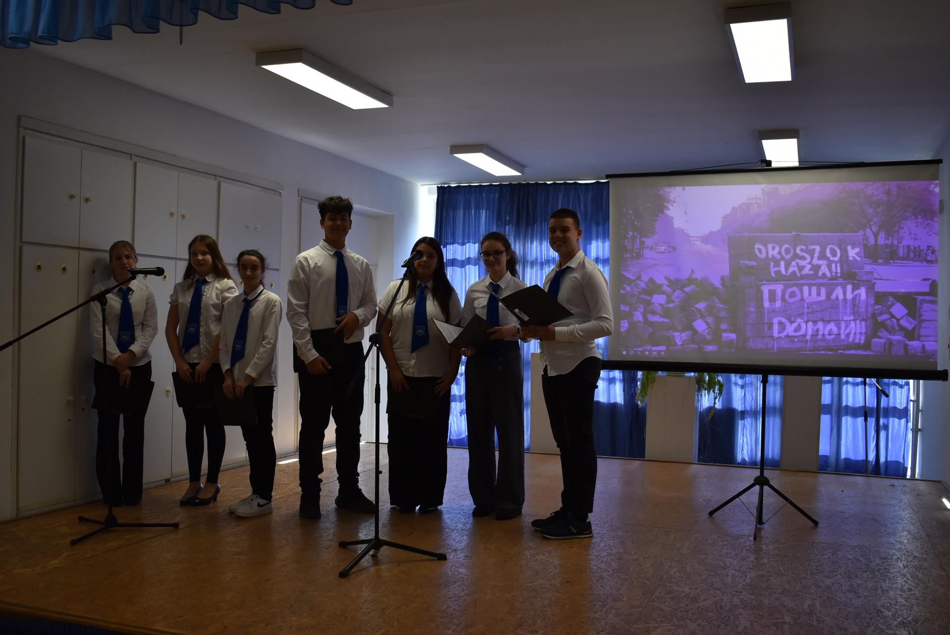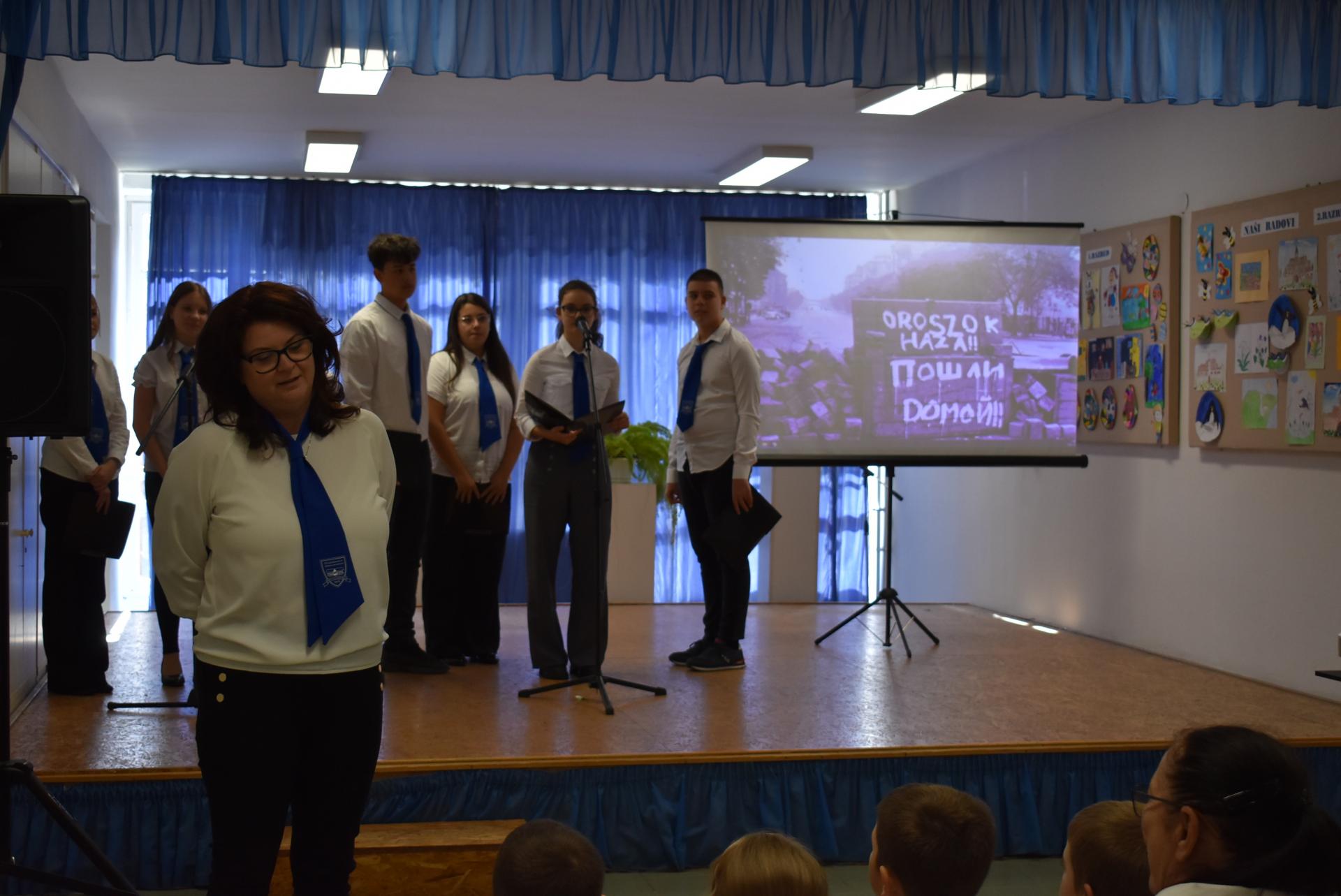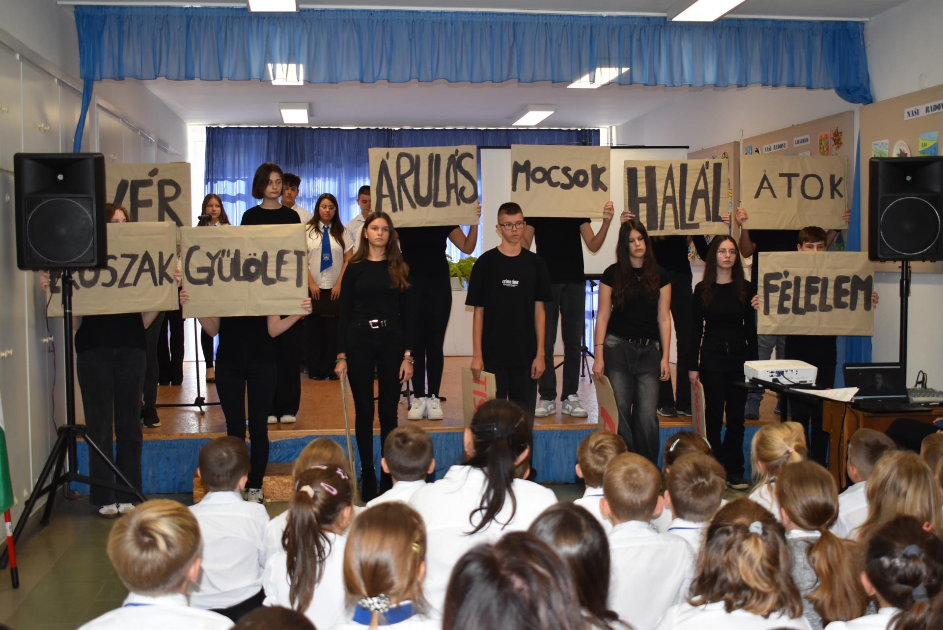 Hírek 1956.október 23-i megemlékezés iskolánkban - 2025 2025. október 22., szerda @ 16:01 Iskolánk 8. osztályos tanulói ünnepi megemlékezéssel készültek az 1956. október 23-i forradalom és szabadságharc évfordulójára. Felkészítő pedagógus: Póczak Eszter Kapcsolódó galéria 1956.október 23-i megemlékezés iskolánkban - 2025 Megosztás