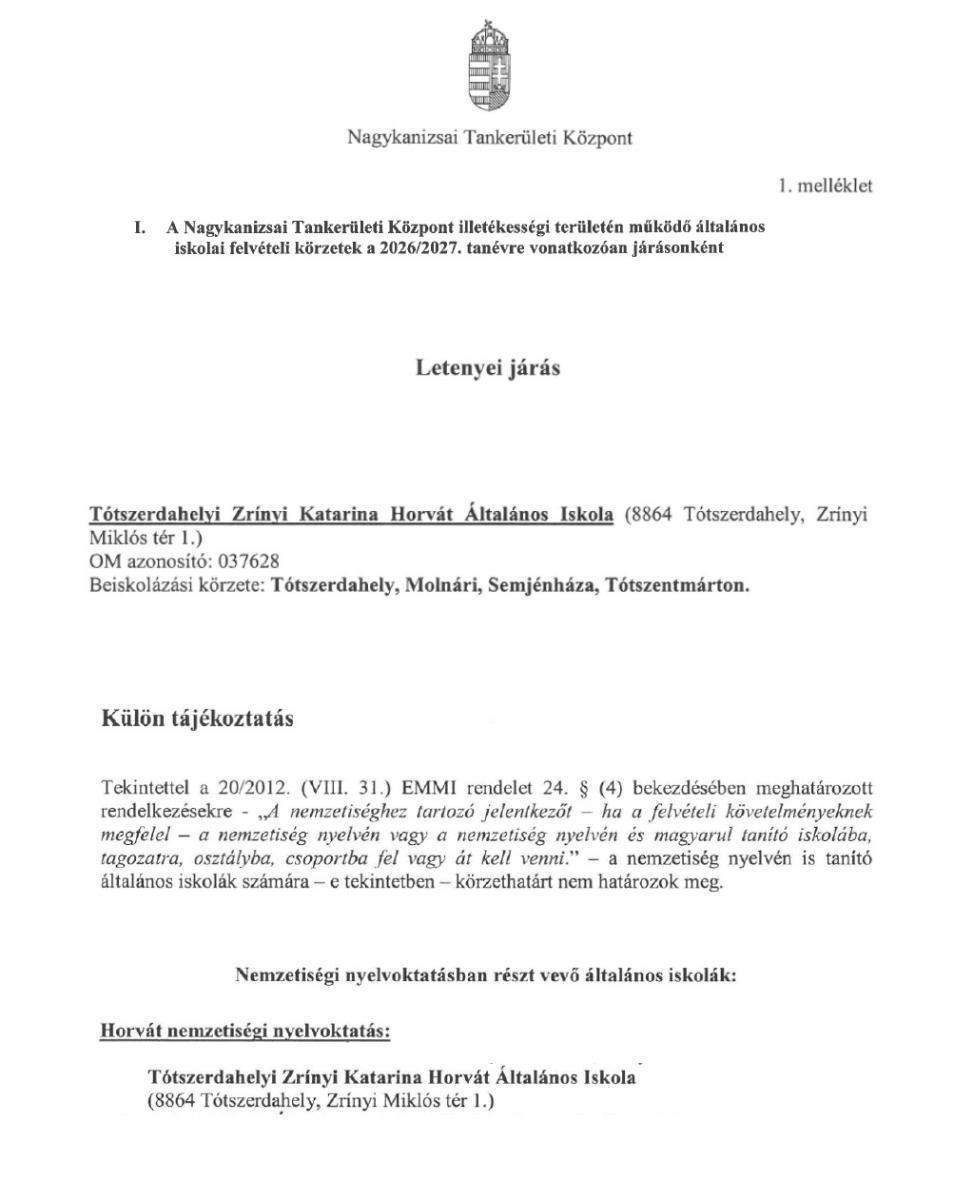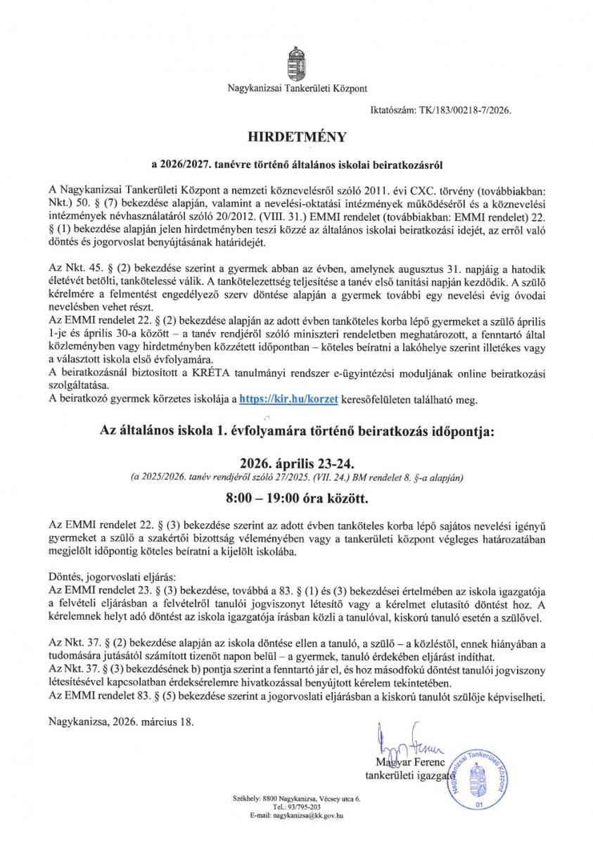 Tájékoztatom Önöket, hogy a 2026/2027. tanév első osztályába 2026. április 23. és 24-én 8:00–19:00 óra között kerül sor a leendő tanulók beíratására.