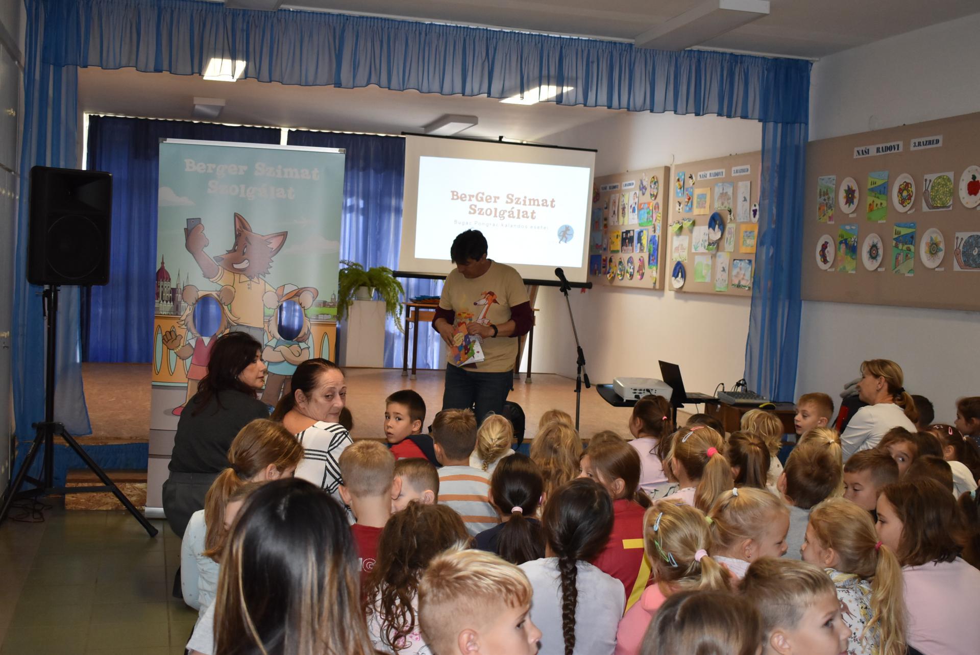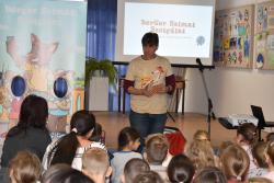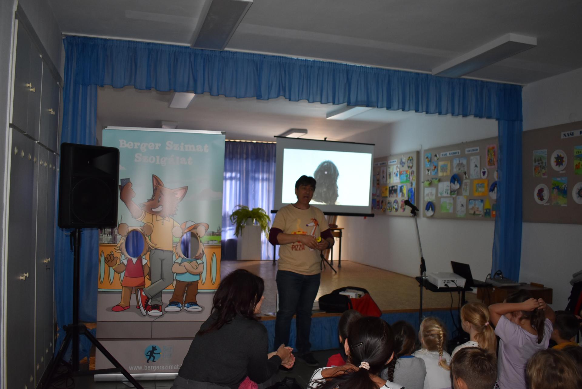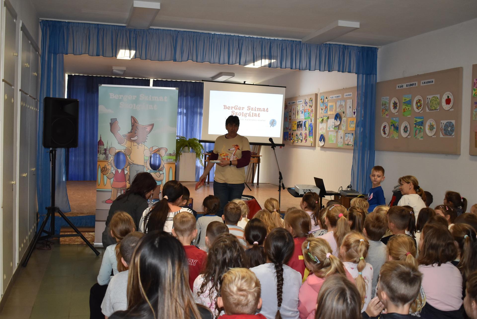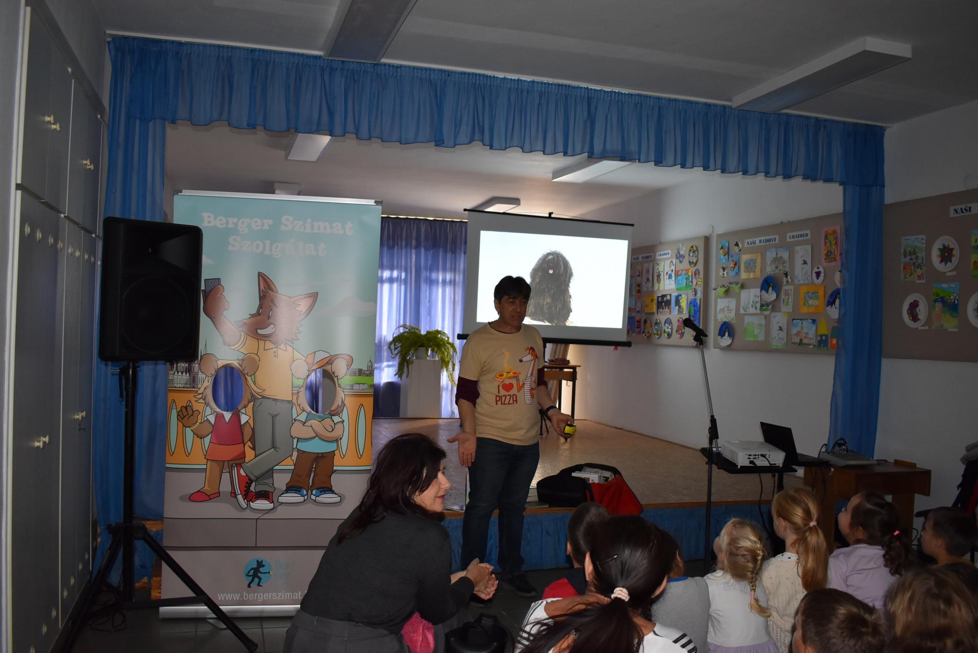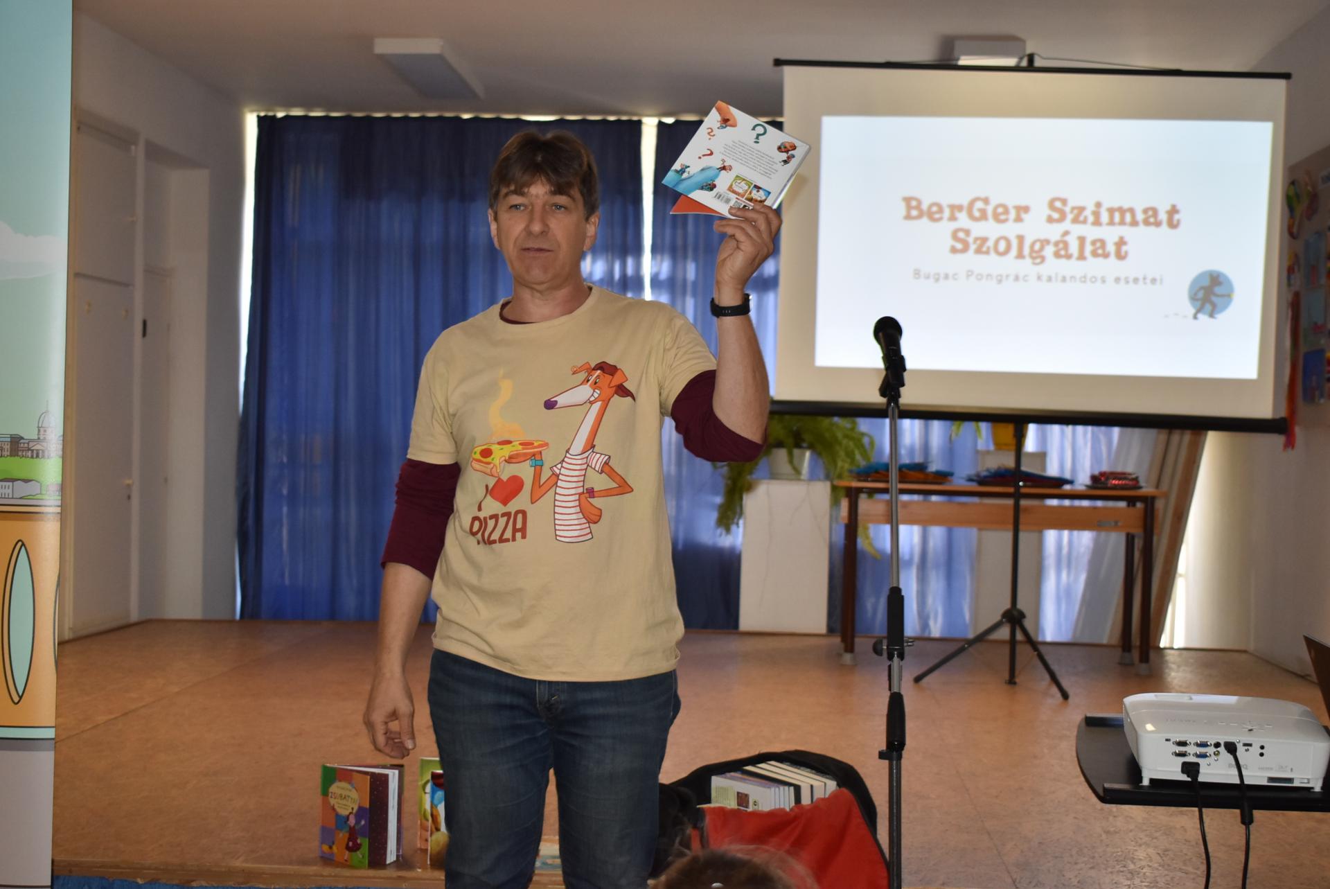 A szerző iskolánkban a BerGer Szimat Szolgálat detektívkutyás sorozatát mutatta be, ami tele van humorral, izgalommal és amit a gyerekek nagy érdeklődéssel fogadtak.