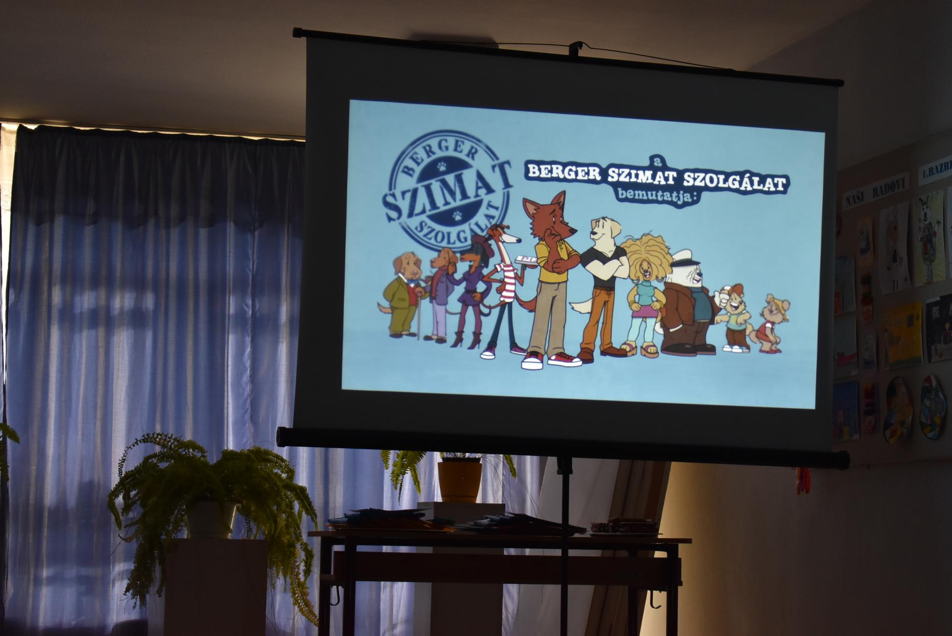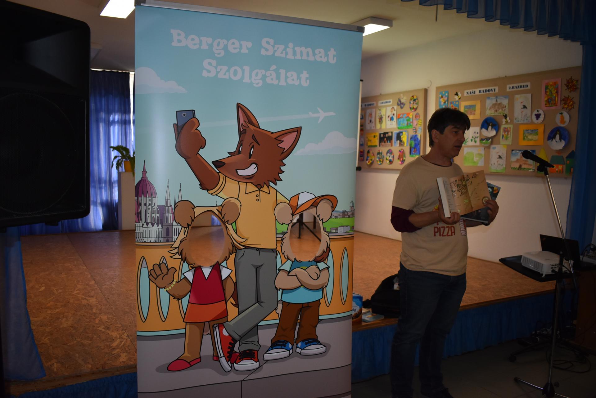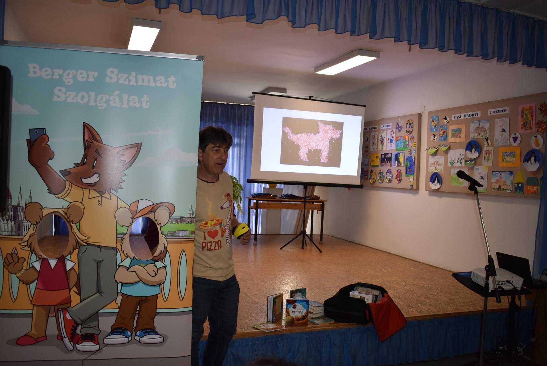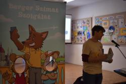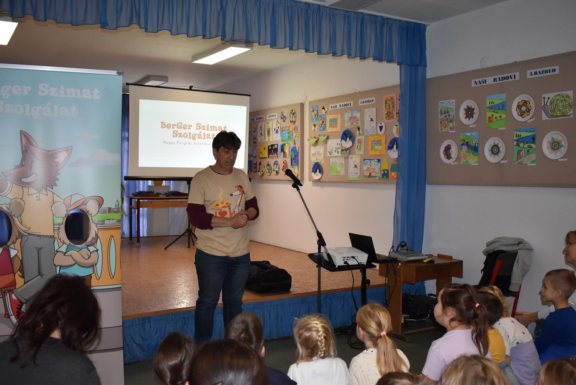A szerző iskolánkban a BerGer Szimat Szolgálat detektívkutyás sorozatát mutatta be, ami tele van humorral, izgalommal és amit a gyerekek nagy érdeklődéssel fogadtak.